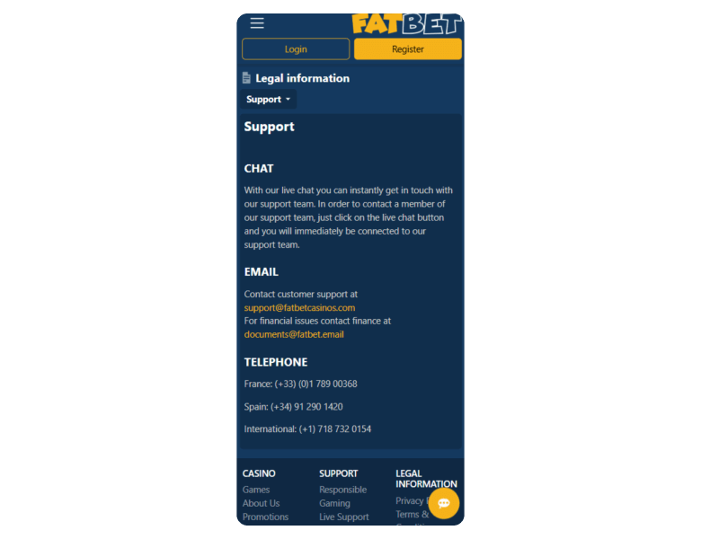 Fatbet has a 24/7 customer support service. They support three channels of communication. You can use email and telephone without having to log in. For live chat, you need to be logged in to your account.