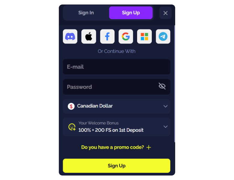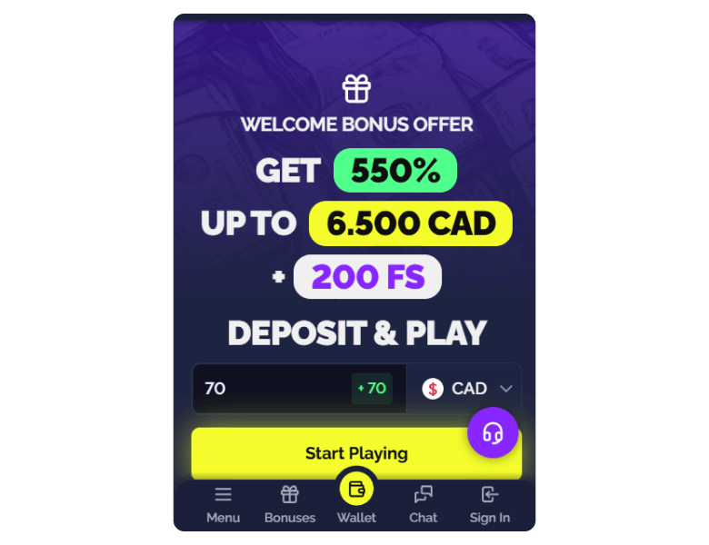| Welcome Bonus | 550% up to C$6,500 + 200 Free Spins | C$20 | 45x | Not Required |