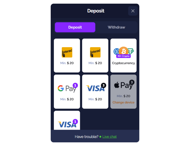 Goldbet leans heavily into crypto, with over 25 supported coins including Bitcoin, Ethereum, USDT, and Monero. At the same time, Canadian players still get local options like Interac, Visa, Mastercard, and Apple Pay. All deposits are instant, and withdrawals typically take 0–2 banking days.