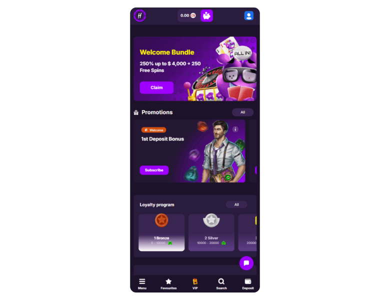 HitMe delivers over 6,800 games, including slots, live tables, crash games, shows, and poker. Virtual sports betting opportunities are also available on the site. Besides the games, HitMe delivers a good bonus package with a unique no-max cashout policy.