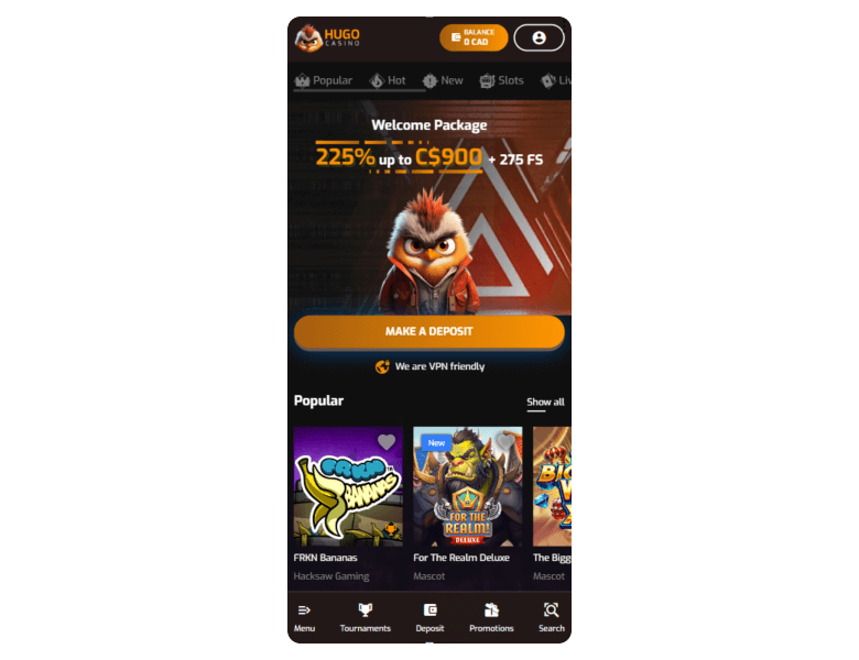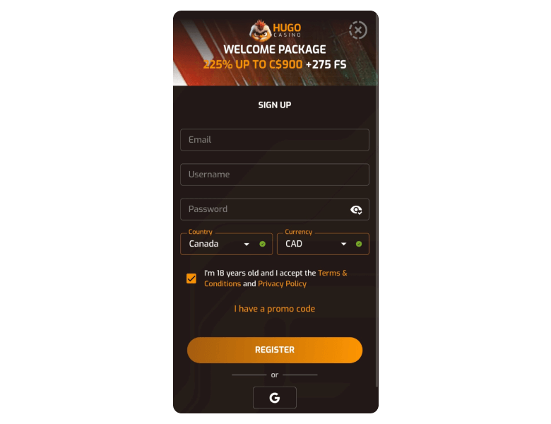 I went to the promotions section of Hugo Casino before signing up to see what they had to offer. There were bonus options for regular and VIP players, but the C$750 minimum deposit needed to get the high roller bonus was a lot more than I thought it would be. I chose the normal welcome offer to get things going and put in only C$30.