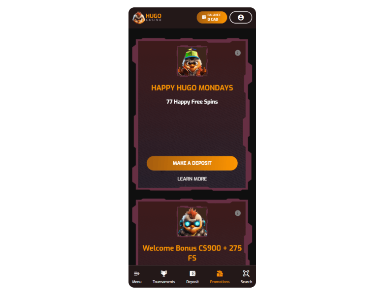 Hugo Cashback | Up to 10% weekly VIP tier-based offer | C$75 | 30x | Not Required |