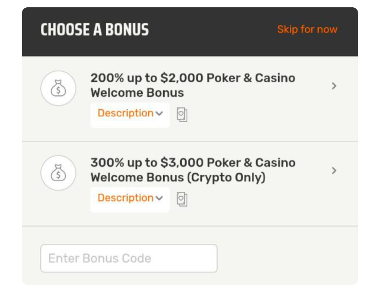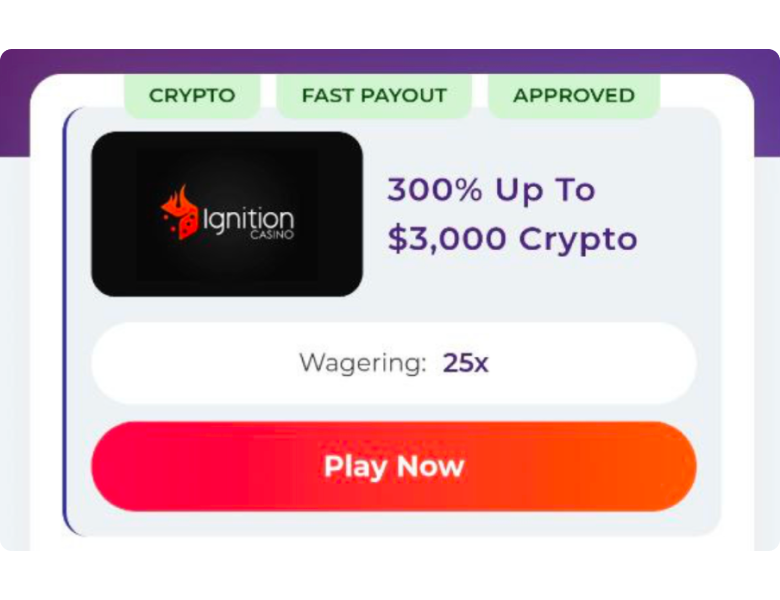 Ignition mixes a split poker-and-casino welcome deal with a pretty hefty package: crypto players can grab a 300% match up to $3,000, while card users get up to $2,000 in bonuses.
