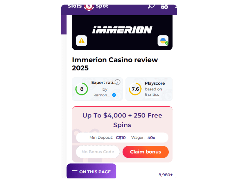 Review Disclosure: This review reflects my personal experience after testing Immerion Casino’s games, bonuses, payments, and support as a regular player over the course of a week.