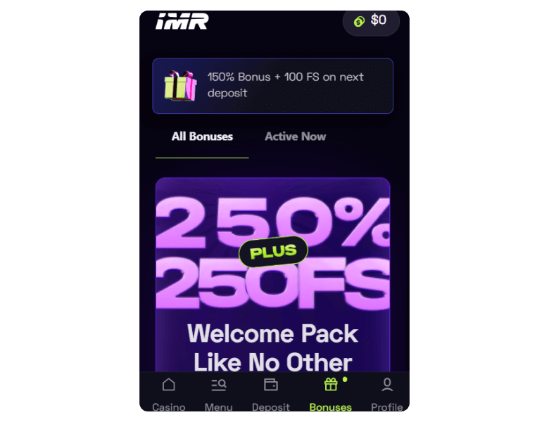 Immerion Casino runs two main bonus tracks: a regular welcome package and a high roller alternative. Both give free spins on Sweet Bonanza 1000 and include four deposit bonuses. No bonus codes are required, and all offers are automatically credited.
