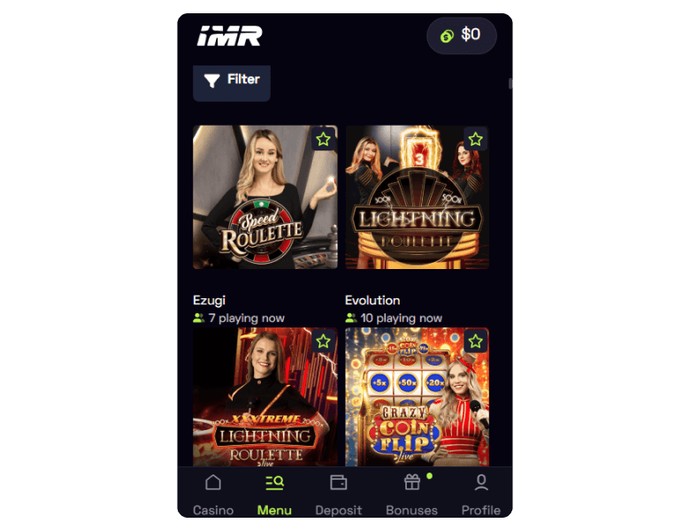 Immerion’s live section features 568 games powered by leading studios like Evolution, Pragmatic Play Live, and Ezugi.