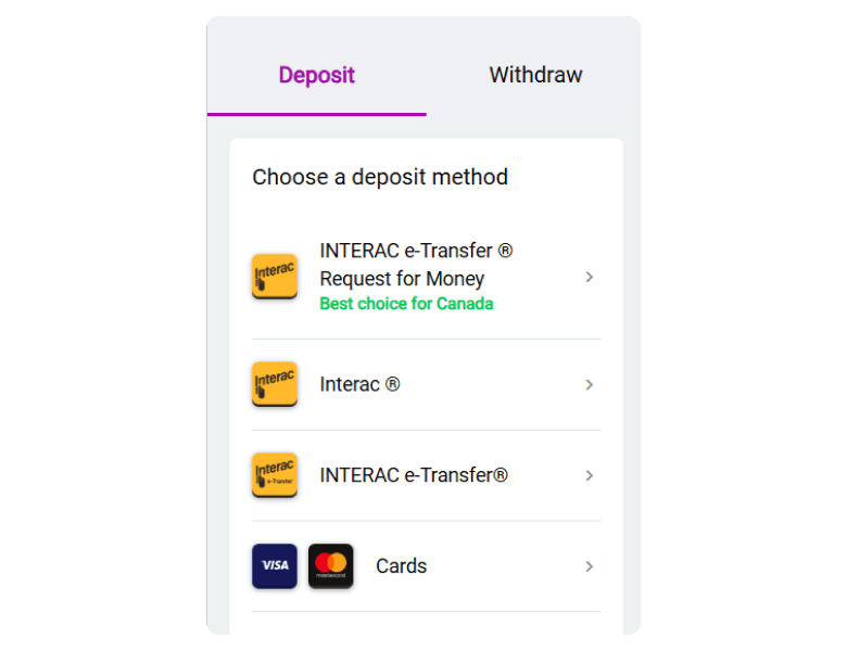 For withdrawals, you can use six methods, including Interac, bank wire, MuchBetter, Visa, and iDebit. See the limits and withdrawal times below.