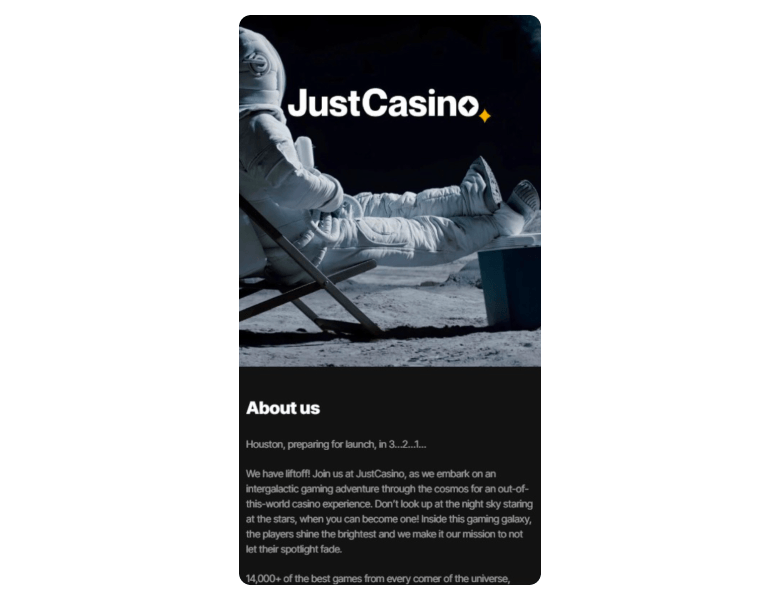 JustCasino provides a well-thought-out mobile version of the site that satisfies the needs of gamblers. It is it who will allow users from all over the world to enjoy games, bonuses and other features of the platform anywhere, anytime. And launching it is as easy as shelling pears: just open JustCasino in any browser of your smartphone or tablet.