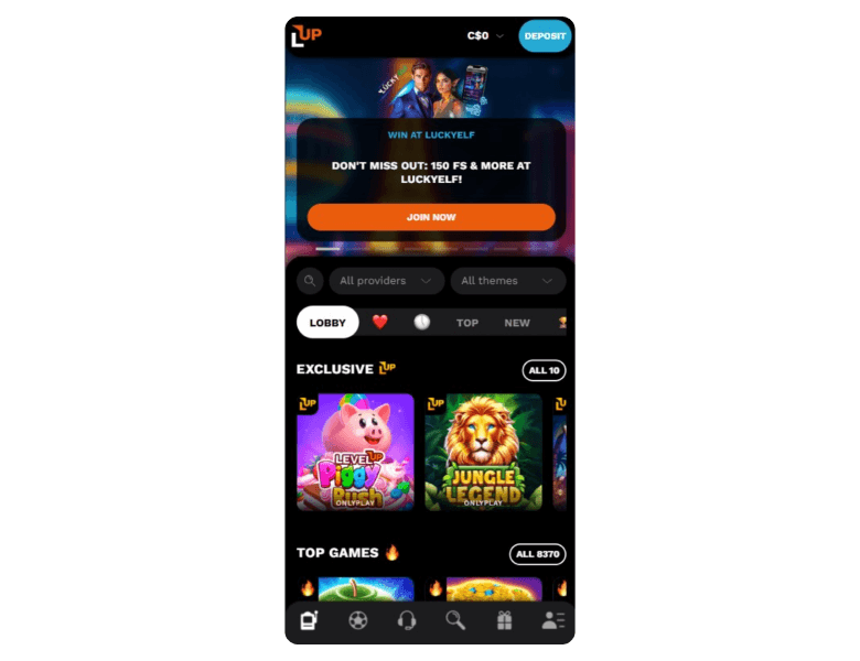 Level Up has a great catalog of 5,000+ games and makes a strong focus on live titles, providing sessions in high 4k quality with appropriate soundtracks and professional dealers. Its library is powered by industry giants like Ptagmatic Play, Onlyplay, Octoplay, and others, so gaming there is definitely safe, fair, and exiting.