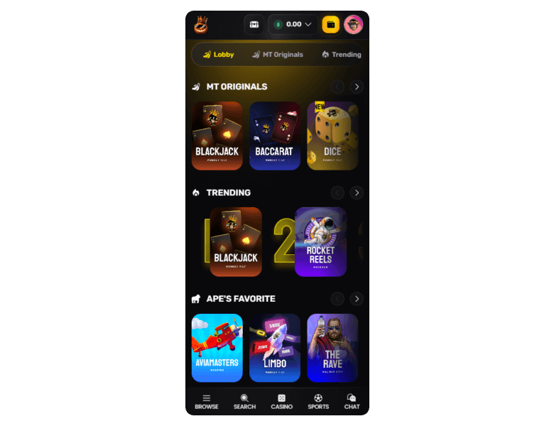 Exclusive games by MT — Plinko, Blackjack, Baccarat, etc.