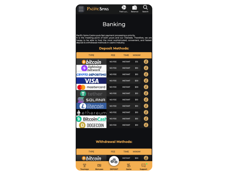 The downsides? Well… The customer support could use some work. The agents only speak English, and even in live chat, I had to wait 5 minutes for a response. I also emailed support@pacificspins.com and got a reply almost two hours later — not exactly lightning-fast. But here’s the good part: I cashed out in Litecoin with zero issues, and my funds landed instantly. However, while you can deposit using 12 different payment methods, only 2 are available for withdrawals. It's not a dealbreaker, but it's something to keep in mind.