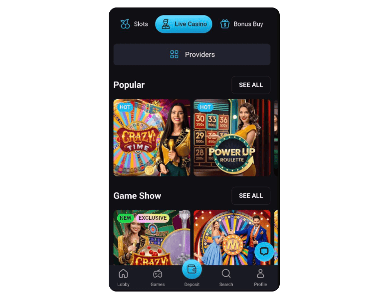 | Live casino providers | 10+ |