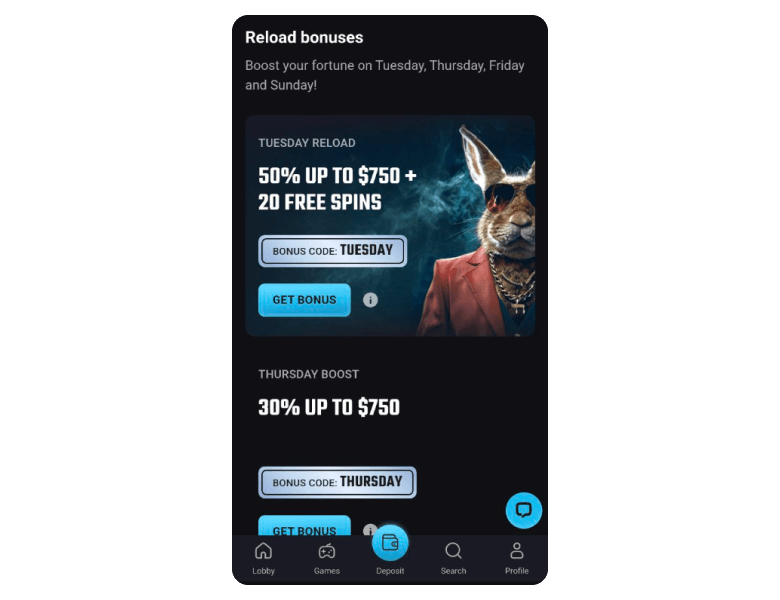 | Match bonus | Tuesday Reload – 50% up to $500 + 20 Free Spins | $30 | 40x | TUESDAY |