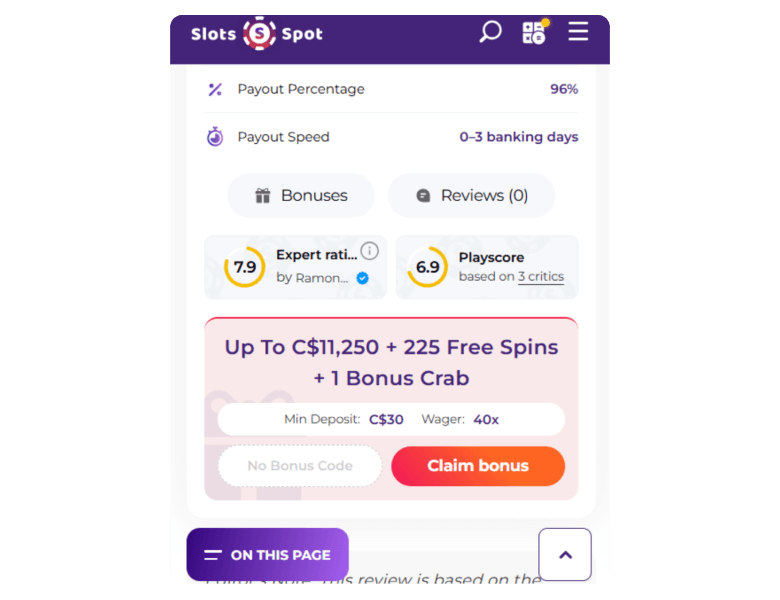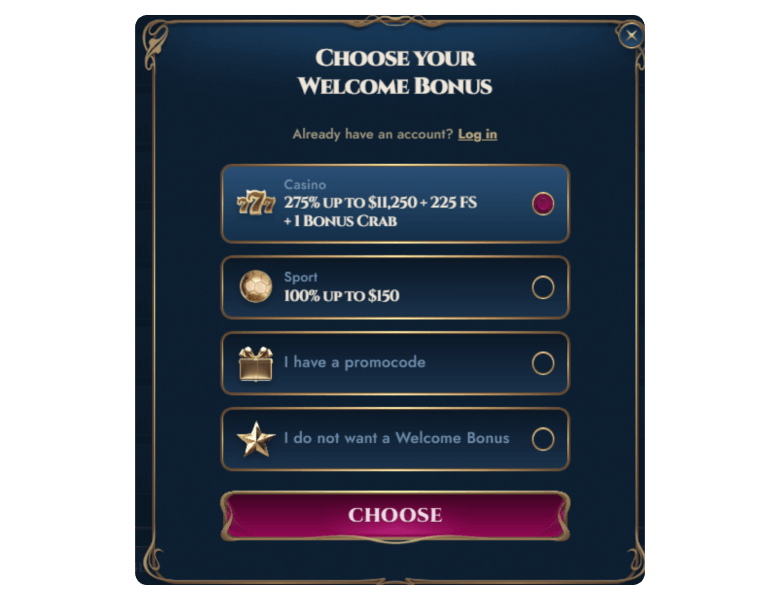 Up to C$11,250 + 225 FS + 1 Bonus Crab | C$30 | 50x (deposit + bonus) | No Code Required | |