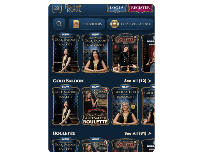 Below, you can see an overview of the live dealer section at RichRoyal Casino: