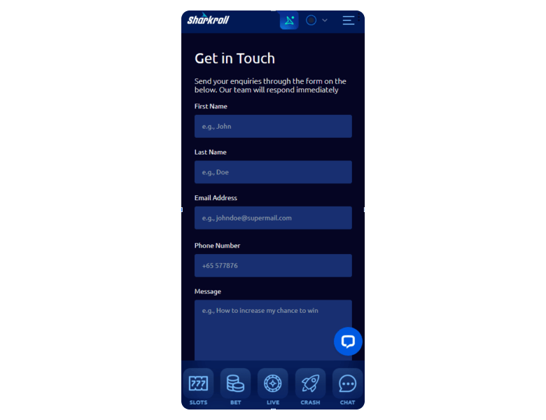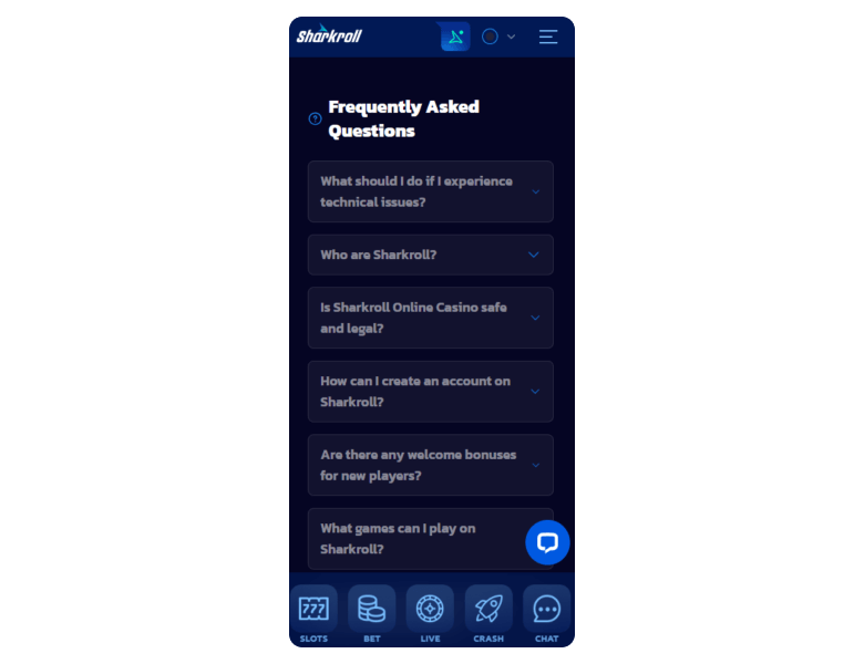 You can get your queries resolved on Sharkroll Casino by sending an email or hitting the floating blue chat button to talk to an agent. An FAQ page and help center are also available, just in case you prefer the self-help route.