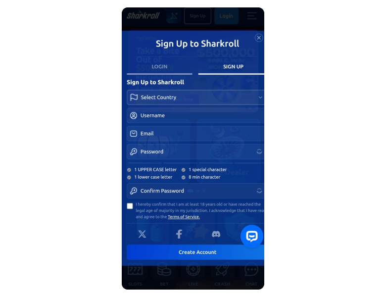 Opening a new account on Sharkroll Casino is a simple procedure that takes less than 2 minutes. Here's how to go about it: