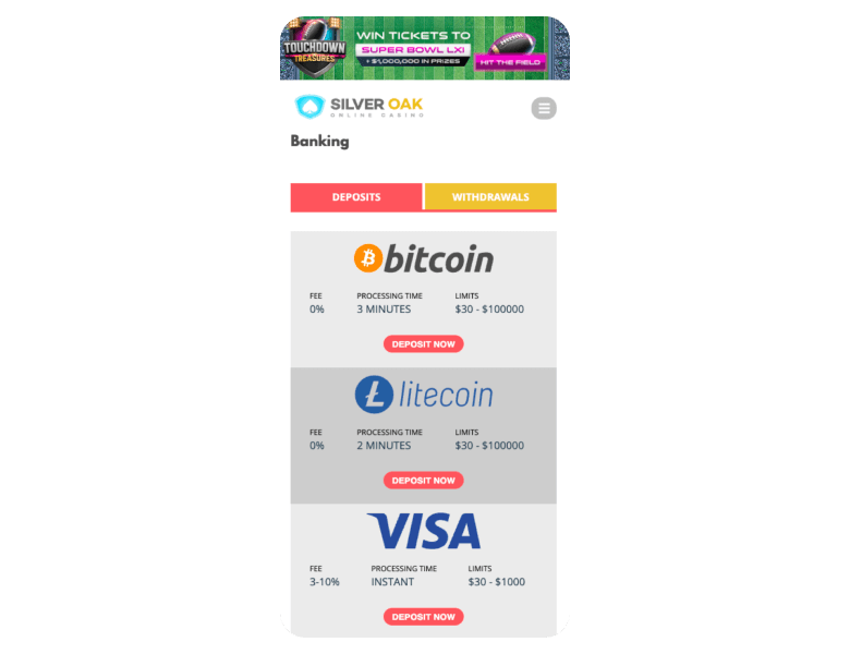 There is a week limit for the withdrawals at Silver Oak Casino, which is 2500 dollars. However, such a high limit rate won`t be a problem for most of the players. Silver Oak Casino is a US-friendly casino. That`s why the available currency is the US Dollar.