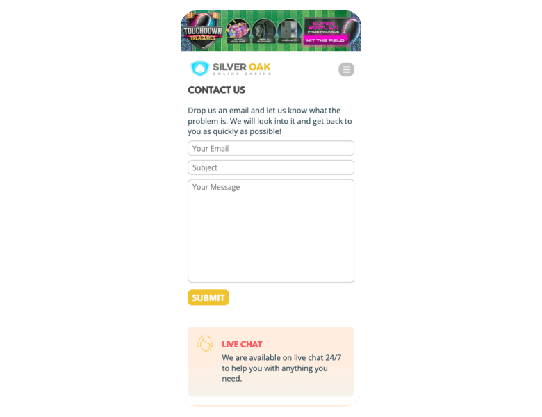 There are a lot of ways to contact the support staff at Silver Oak Casino. They are phone calls, Skype, email and even fax. The FAQ page presents too. All the options are available 24 hours a day, 7 days per week. And there is a Live Chat for a quick connection with the support team. As everyone can see, Silver Oak Casino does its best to provide secure and convenient gambling for its players. Being the US-friendly casino, Silver Oak Casino provides customer support in English.