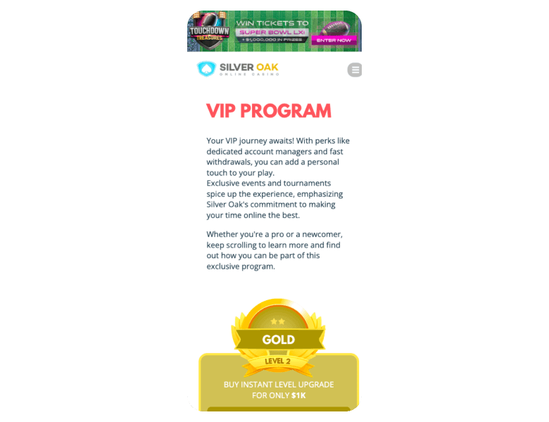The Players Rewards Card is another exclusive advantage of this online casino. The players can use it to increase their benefits and enhance the joy of gambling at Silver Oak Casino. Regular players can expect the growth of the bonuses to 160% only for being constant in the gaming. There are also loyalty benefits at Silver Oak Casino. One can find 5 degrees of VIP membership. The players can accomplish them by increasing the loyalty points from 3 thousand for the Palm tree. It is the lowest rate, to 6 and half million for the Mighty Oak, which is the highest VIP level. Lots of the benefits, such as higher bonuses and faster getting the loyalty points, are waiting for the gamblers since they are the VIP members. All these lead to bigger cash prizes for every VIP player. There are also tournaments in Silver Oak Casino. One can win and get other prizes and bonuses as the deposit or cash ones.