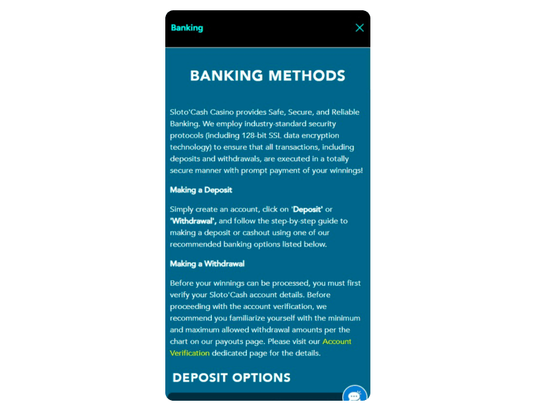 At Sloto Cash Casino players have several options for making a deposit in order to receive their money in their online wallet, and they are ready to play the games of their choice. These deposit methods are: