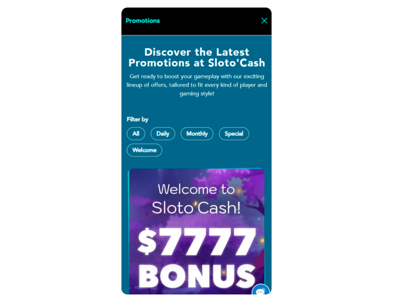 Your $7,777 Welcome Bonus. Sloto Cash casino offers one of the best welcome bonuses ever, adding up to 7,777 USD in free bonus money, plus 300 free spins on a designate online slot machine. This fantastic welcome bonus package begins when you make your first real money deposit, and you receive a 200% bonus up to 2000 USD in bonus money, plus 100 free spins for the slots. There are even more bonuses and free spins after your second, third, fourth, and fifth deposits. It can all add up to $7,777 in bonuses and 300 free spins, and that is truly a Wonderful Welcome Bonus Package. As long as you remain a Sloto Cash casino client, you can enjoy the $1,000 Free Casino Games Bonus, 400% Highroller Bonus, the $7 online slots real money no deposit bonus, and the 25% Cashback Bonus! For more information on bonuses and promotions, keep your eye on the Promotion page to see what treats SlotoCash casino offers every month for their customers.