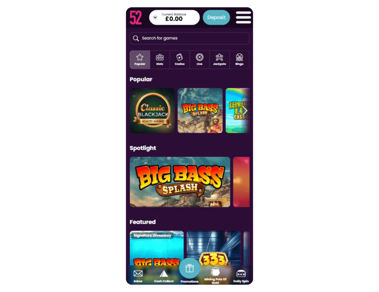 Screenshot of the main sections of the casino website: