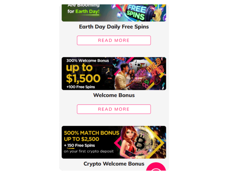 When you join SlotsandCasino, you can claim a welcome bonus of up to $1,500 with 100 free spins for your fiat deposit. There are cashbacks, free spins, and giveaways as you go on.