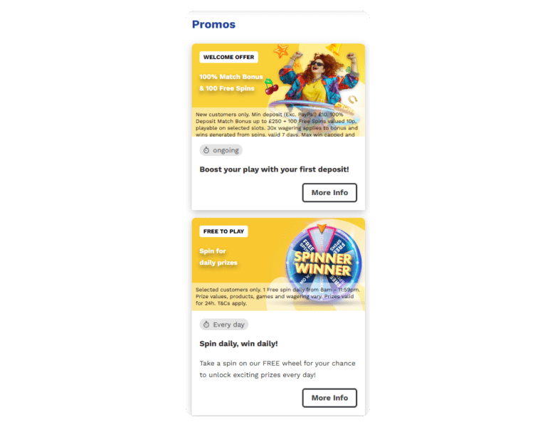 The Spin and Win welcome bonus offered me a 100% bonus of up to £250 and 100 free spins on 10 of my favourite Fishin’ Frenzy slot games. My balance, after making a £50 deposit, instantly increased to £100, and the free spins were ready for me to spin.