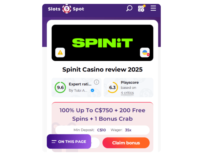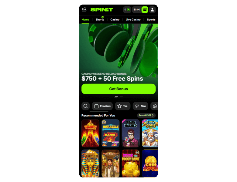 SpinIt Casino launched in 2025 and looks ready to serve players from Canada, Australia, New Zealand, South Africa, and most of Europe. It runs strictly as an online casino and sportsbook, so don’t expect poker rooms. What you get instead is a heavy focus on slot games, live tables, and crypto payments.