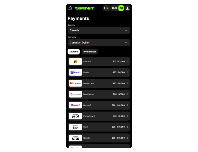 SpinIt supports both fiat and crypto, which makes it flexible no matter how you prefer to pay. I liked that most deposit options are instant and free, while withdrawals clear in one to 3 days with no hidden fees. The payment setup worked consistently whether I used Interac in Canada or Litecoin abroad.