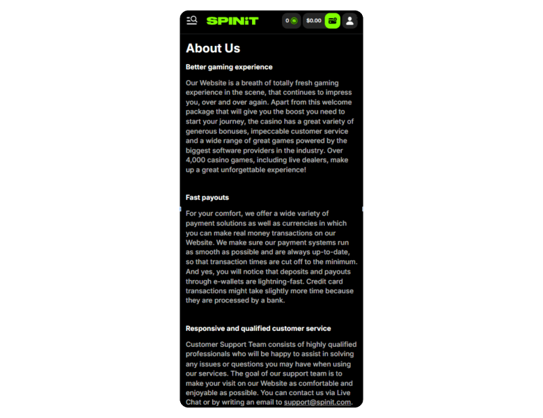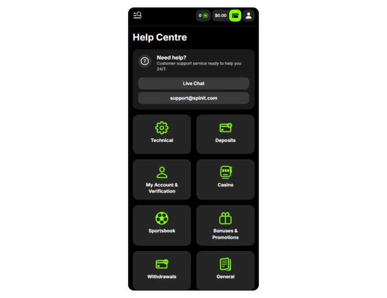 There is no phone line available, but you can also reach email support at support@spinit.com and access a help center. In terms of support quality, the agents provided clear answers to all inquiries, including bonus terms and payout times.