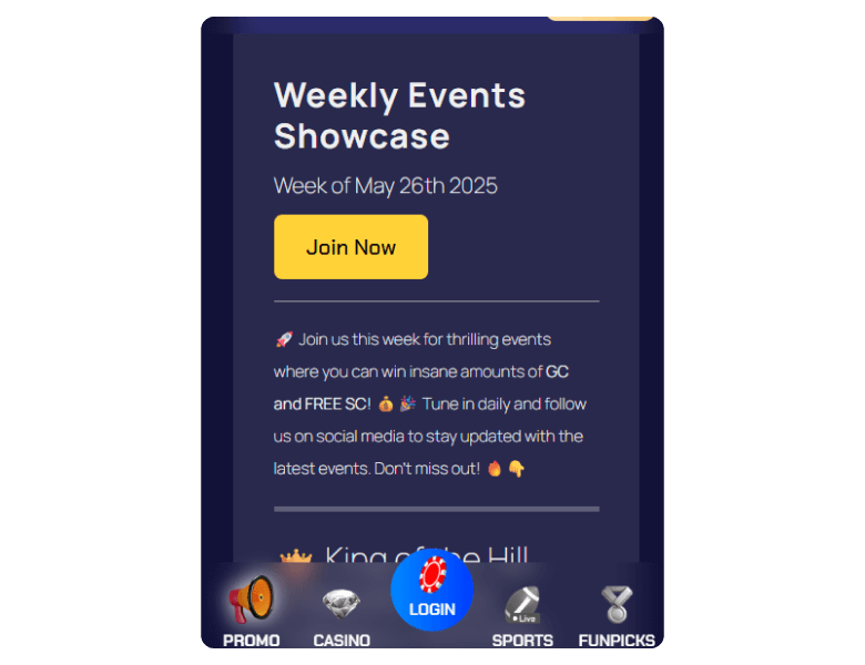 Regular tournaments and leaderboard competitions offer additional SC prizes. The platform frequently runs parlay boosts for sports predictions and slot-specific promotions tied to new game releases.