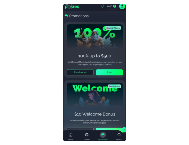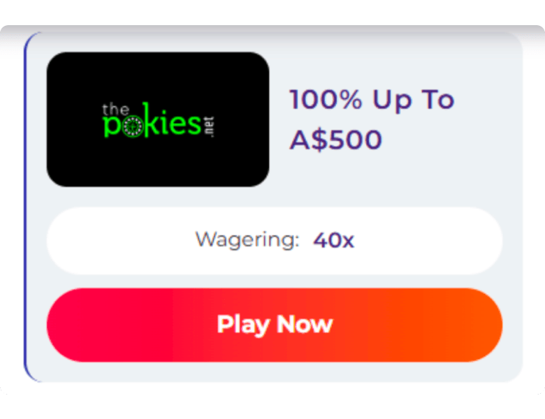 The Pokies runs two welcome offers: a 100% match up to A$500 (40x wagering, A$30 min deposit) and a free A$10 no deposit bonus (also 40x). No bonus codes needed for either.