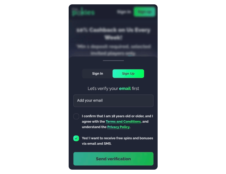 You’ll first be asked to verify your email, so type it into the Add your email field and make sure it’s one you can access right away. In the same step confirm that you’re 18 or older and agree to the Terms and Conditions and Privacy Policy, then decide whether you want promo emails and SMS offers before moving on.