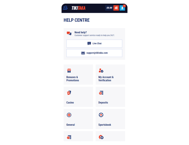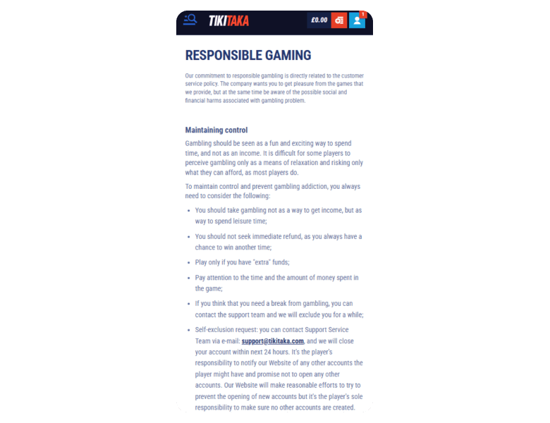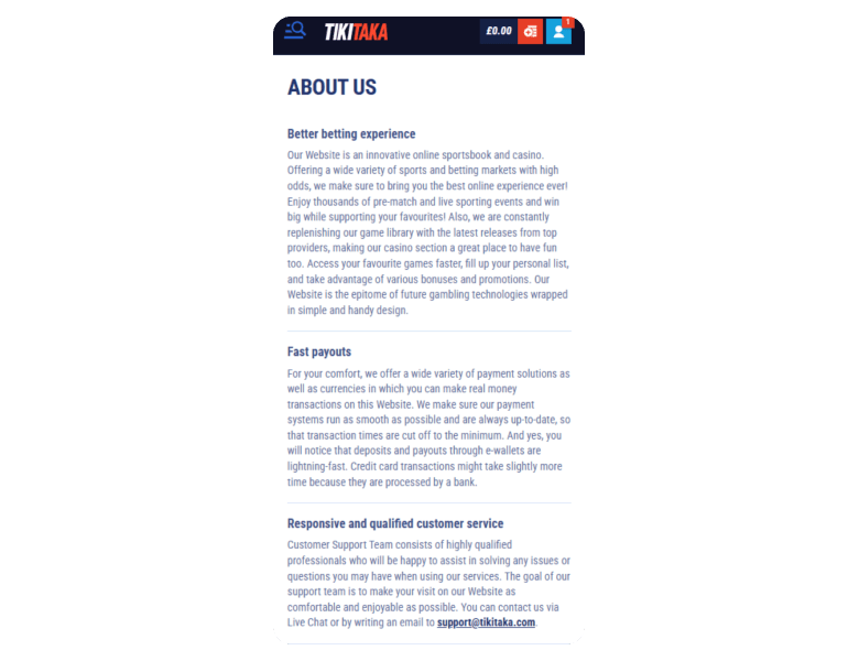At that moment, I didn't know some withdrawal aspects, so I had to send a message in the live chat to find a solution. The reply came in less than a minute, super fast! Simultaneously with the letter in the chat, I sent a letter to email (support@tikitaka.com), but that took about 30 minutes for a response. Anyway, both times, the agents were clear and helpful, with no automated nonsense. What about withdrawals at the end? Everything works with Visa, MasterCard, USDTether TRC20, Bitcoin, Litecoin, Dogecoin, Revolut, or Bank Transfer. A limit of £5,000 is really cool, and it was enough for me.