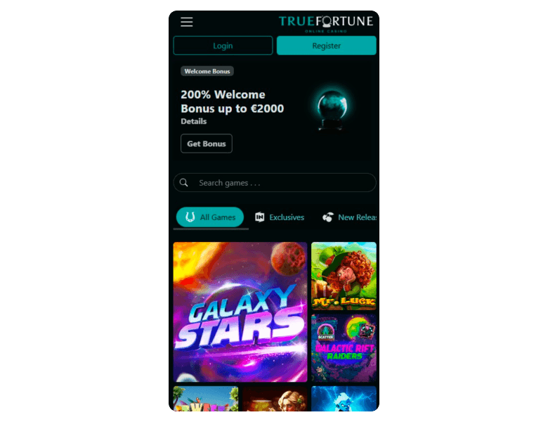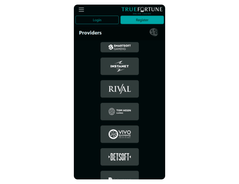 True Fortune offers different types of games — anything from slots and roulette to baccarat and bingo is here. It’s rather the quantity of those that’s far from large. I’d like to see it get bigger in the future. However, the essentials are covered, with a clear focus on slot gameplay. Adding buttons for “Recent Games” and “Favorites” was a smart move, too; I personally used it multiple times. Sooo helpful.