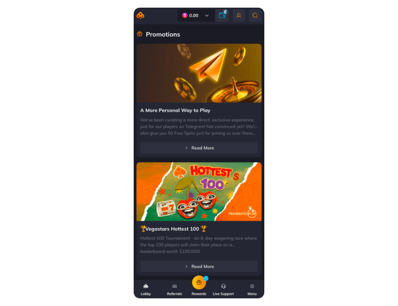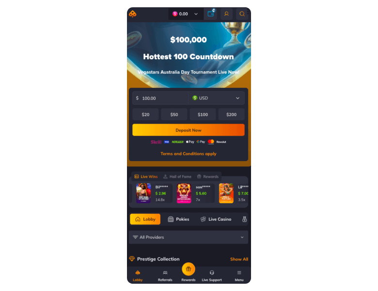 Vegastars is a modern platform that is a good fit for Canadians who like playing high-paying or trending slots. It might not be suitable for people who are into high-limit table games or want to use VISA for withdrawals. Try it cost-efficiently with the A$6,000 welcome bonus.