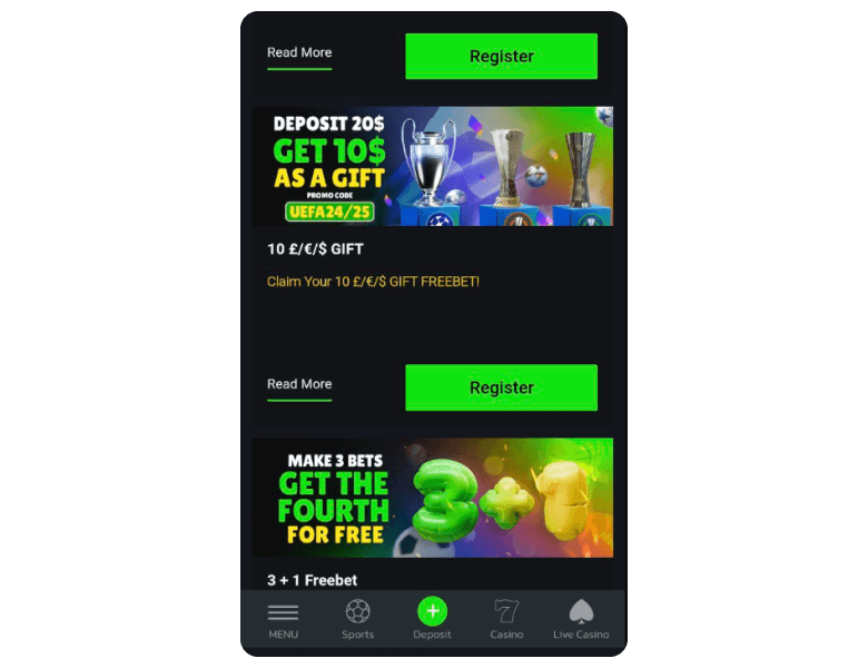 | Betting Bonus | 3+1 Freebet | $10 Minimum Bets | Not Required | Not Required |