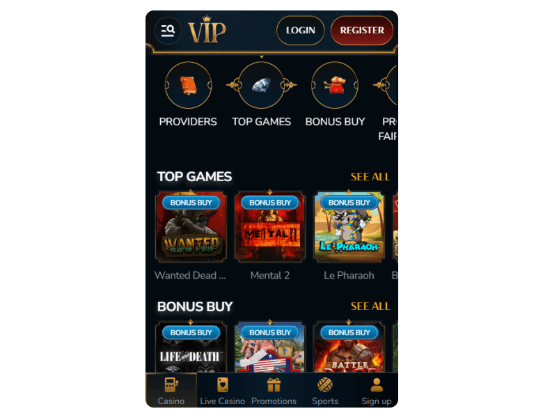 VIPcasino integrates content from over 115 software providers, with more than 100 focused on slot development alone. The site features games built on stable engines like Hacksaw Gaming, Nolimit City, Play’n GO, and Evolution Gaming, ensuring fast loads, mobile optimization, and access to advanced mechanics like xWays, multipliers, and bonus buys.