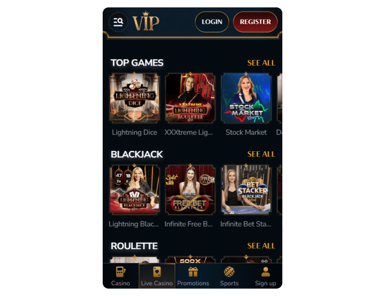 The live dealer section at VIPcasino is extensive, with professional-grade streams and diverse table limits. The platform features blackjack, roulette, and game shows powered by industry leaders like Evolution Gaming and Pragmatic Play Live.