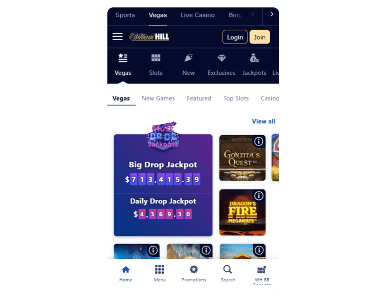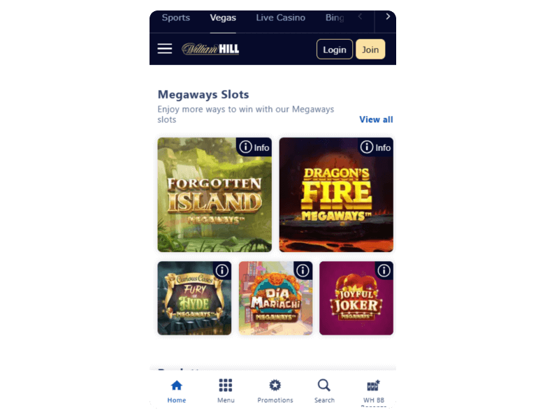William Hill Vegas has around 500 games, most of which are developed by top software companies. There is a big collection of Big Bass slots, as well as populars like Gates of Olympus, Wolf Gold, and Sugar Rush, which are available for Drop & Wins play. The variety extends into the section with the Megaways mechanic.