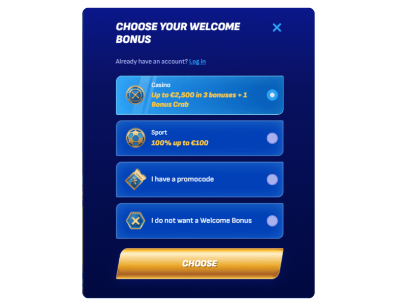 | Welcome bonus | Up to C$3,750 + 200 FS + 1 Bonus Crab | C$30 | 40x | Not Required |