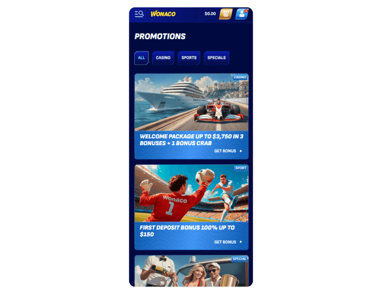 Wonaco packs in several bonus options, starting with a multi-part welcome deal that includes spins, match bonuses, and even a Bonus Crab feature. There’s also a rotating mix of reloads, cashback offers, and no deposit deals tied to specific days of the week.