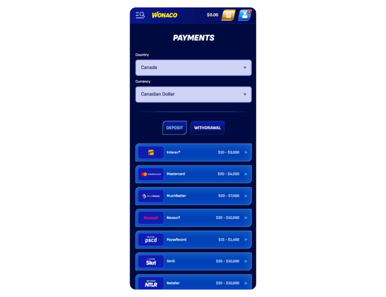 Wonaco supports a wide range of payments, from Canadian-friendly options like Interac to major cryptos like Bitcoin and Dogecoin. You’ll also find e-wallets, vouchers, and even low-limit bank transfers with no fees.