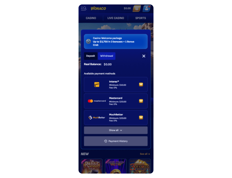 Wonaco’s payment options cover a lot of ground. Whether you're into crypto or prefer trusted local methods like Interac, the site makes it easy to cash in and out. I tested both Interac and Bitcoin for deposits and withdrawals, and in both cases, the transactions went through without issues. The C$10 minimum on Interac deposits is especially good for casual players.
