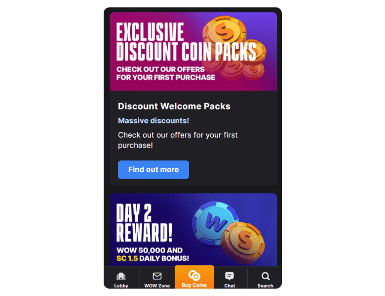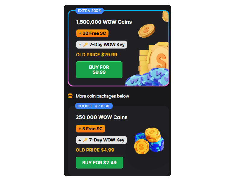 | First Purchase Deal | 1,500,000 WOW Coins + 30 SC for $9.99 on your first Gold Coin purchase. One-time optional offer with excellent value. |