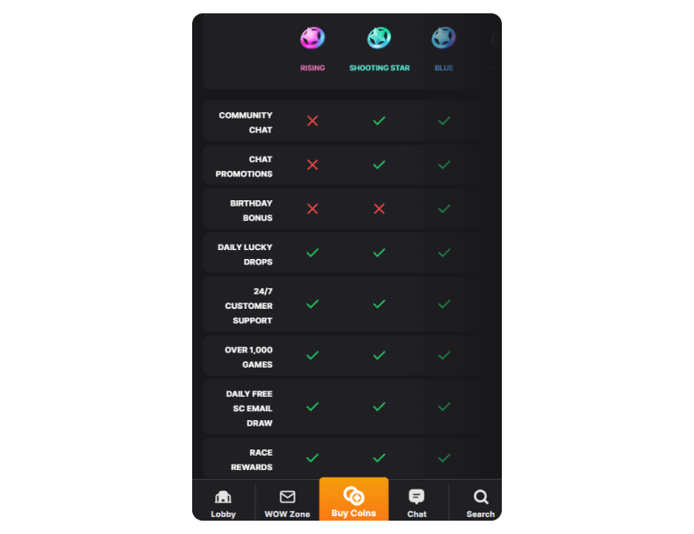 | Refer a Friend | Get 20 SC + 5,000 WOW Coins for each friend who joins via your referral link and fulfills requirements. |