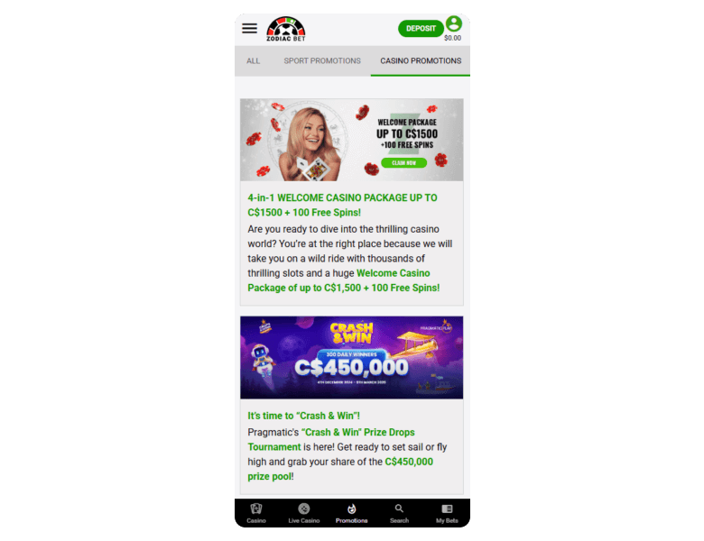 Zodiac stands out by focusing on crypto payments among the traditional options: the site supports 7 digital coins for deposits and withdrawals. You can also fund an account and make payouts in nearly 40 fiat currencies, and the maximum withdrawal cap is C$9,999, which makes this casino a nice option for confident players.