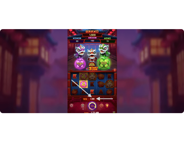 3 Lucky Lion offers 4 jackpots at once. To win at least one of them, you need to land a coin with the corresponding mark during the respin bonus round. The size of the jackpots depends on the selected bet, and the multipliers can be found in the paytable. Mini pays x5, Minor — x10, Major — x50, and Grand — x500. At the same time, the jackpot amount will be increased by the coin values collected, guaranteeing the best win.